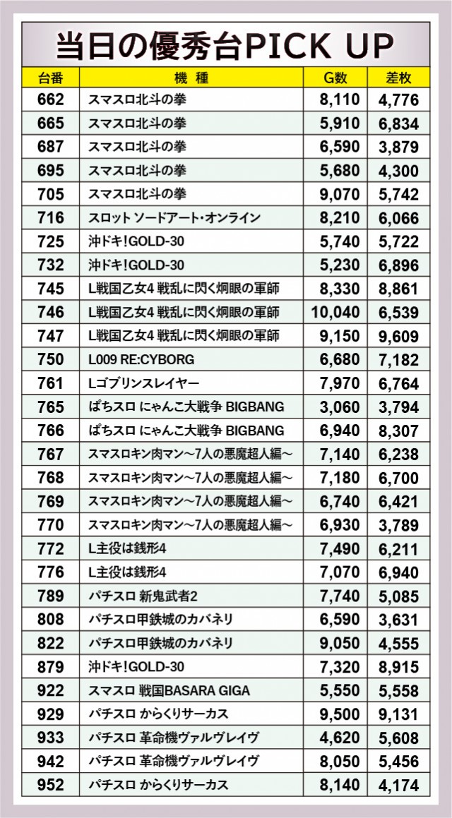 上表をご覧の通り、5千枚OVER台が多く発生していた様子がハッキリと分かる。その中でも『L戦国乙女4 戦乱に閃く炯眼の軍師』745番台+8,861枚や747番台+9,609枚、『スマスロキン肉マン~7人の悪魔超人編~』も3台の6千枚OVER台が生まれるなど、主にスマスロ勢が気を吐いていた。もちろん既存の6.5号機である『沖ドキ!GOLD-30』『パチスロ甲鉄城のカバネリ』も奮起し、まとまった出玉を獲得したファンは笑顔を覗かせていたのが印象的だ。