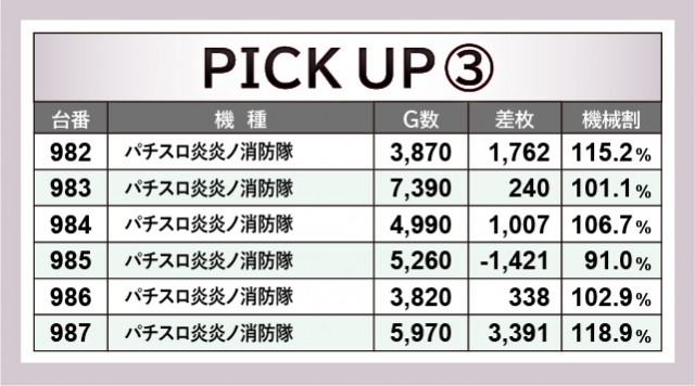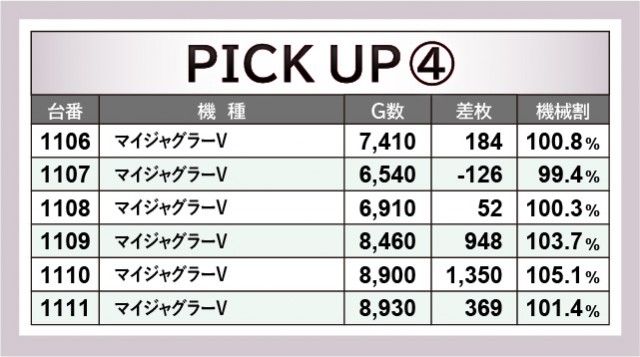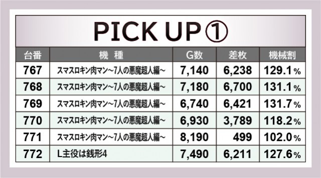 当日は機種単位で6台横並び好況スポットを形成していたのが大きな特徴である。いずれも回転数から手応えのほどを感じることができ、ファンはレバーを力強く叩いていたことだろう。『マイジャグラーⅤ』ではその傾向が顕著で、満足感の高い遊技をできたはずだ。『スマスロキン肉マン~7人の悪魔超人編~』『L主役は銭形4』は6千枚OVER台が発生しており、活気と熱気に満ちた1日になったと断言できる。