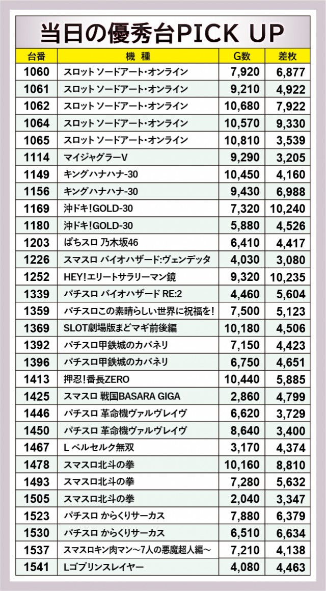 『パチスロ甲鉄城のカバネリ』『スマスロ北斗の拳』など人気機種がしっかり名を連ねており、特に後者は1478番台+8,810枚という記録が目に焼きつく。また全体的に5千枚OVER台の多さが目立っており、その中で『沖ドキ!GOLD-30』1169番台+10,240枚や『HEY!エリートサラリーマン鏡』1252番台+10,235枚という偉大な数字も見られた。万回転OVER台も確認でき、店内は終日を通して活気と熱気に満ちていたと言える。