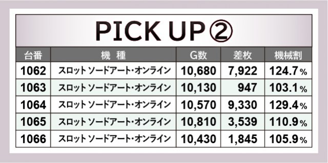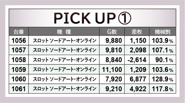 『スロット ソードアート・オンライン』全11台は特に大きな盛り上がりを披露し、いずれの台も閉店まで打ち込まれていた。残念ながら全台プラス差枚を達成することは叶わなかったが、1062番台+7,922枚や1064番台+9,330枚といった大きな熱量が放たれていたため、遊技していたファンの満足度は高かったはずだ。