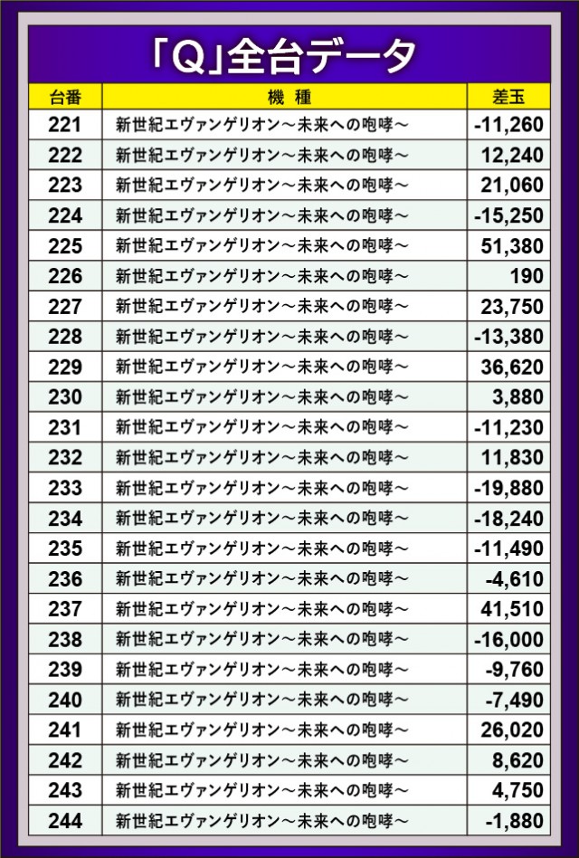 今なおファンからの厚い支持を集める『新世紀エヴァンゲリオン〜未来への咆哮〜』は、225番台+51,380玉を筆頭に、その期待にしっかりと応えてみせた。他にも229番台+36,620玉や237番台+41,510玉といった大きな熱量を確認でき、同機種のポテンシャルは新機種に劣らない高さを示している。簡単に万発OVERを達成する同機種であれば、有意義な時間を過ごせるのはたしかだ。