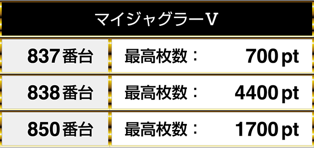 閉店時には『マイジャグラーⅤ』の3台が並んでプラスptを記録し、1台は4400pt!!