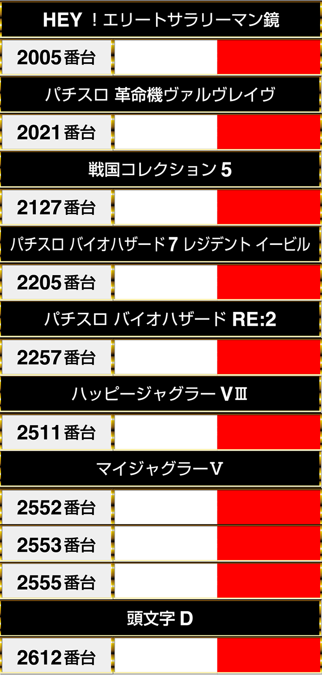 『マイジャグラーⅤ』の2555番台や『頭文字D』の2612番台など、プラスptの台がいくつもあった。