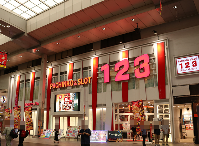 「スマスロ北斗の拳」と「L戦国乙女4 戦乱に閃く炯眼の軍師」を中心に、いくつもの機種が楽しまれていた「123新市街店」。