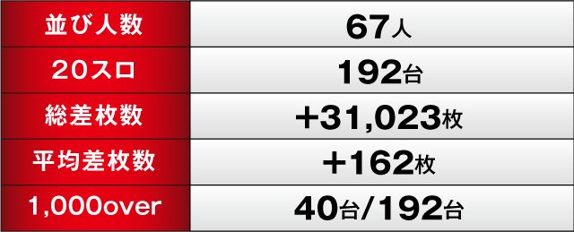 今回は、総差枚+31,023枚、+1,000枚オーバー40/192台という結果となった「アミューズ三田店」。前回に引き続き勝利を収め、トータル6連勝を成し遂げた。同店のポテンシャルを考慮すれば、まだまだ記録更新の可能性が十二分に期待できるので、次回実施時もこれまでのデータを見返して勝利を掴み取って欲しい!