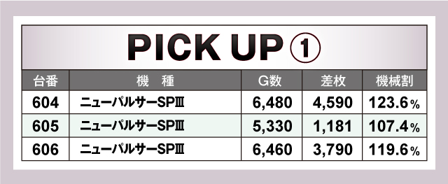 続いては当日3台以上の並びで優秀だった箇所を紹介していこう。上でも取り上げたとおり「ニューパルサーSPⅢ」やジャグラーシリーズなどのノーマルタイプが賑わっており、「ニューパルサーSPⅢ」の平均差枚は+3,187枚と圧倒的だった! また「パチスロ幼女戦記」も3台並びでトータルプラスで終了! 次回実施時は並びに注目して立ち回ってみよう!
