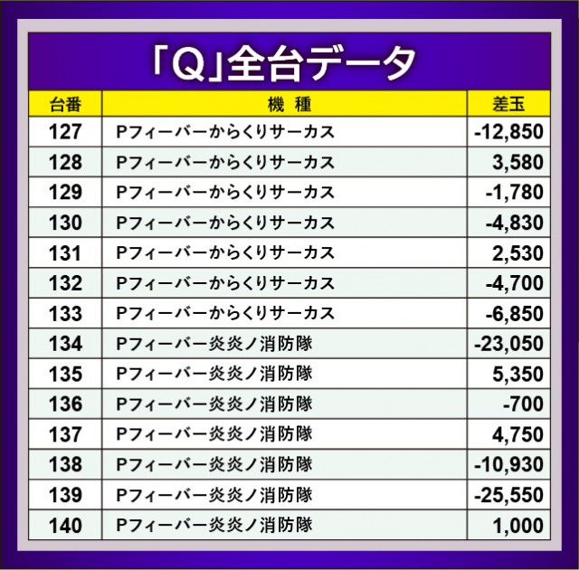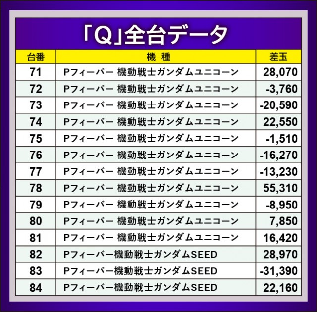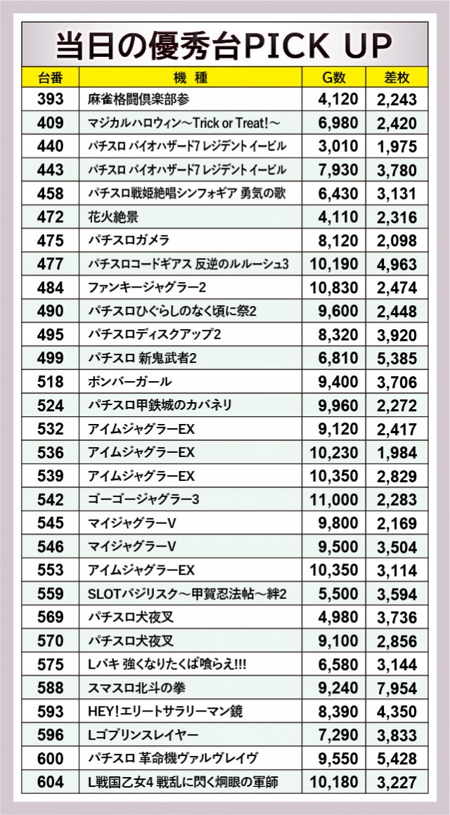 何よりもまず『Pフィーバー 機動戦士ガンダムユニコーン』78番台+55,310玉という記録が目に焼きつき、他にも71番台+28,070玉という数字も確認できる。今なお現役で活躍する理由が窺える結果で、今後も同機種の活躍には期待せずにはいられない。そして『Pフィーバー機動戦士ガンダムSEED』は全3台中2台が2万発OVERを達成。こちらも負けじと熱気を放ち、店内の盛り上がりに貢献した機種と言えるだろう。