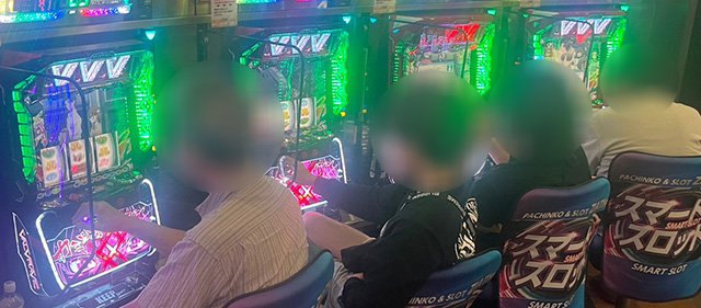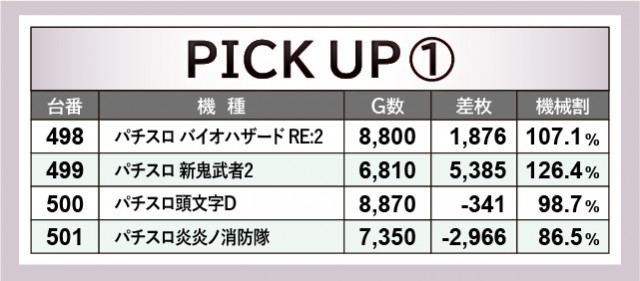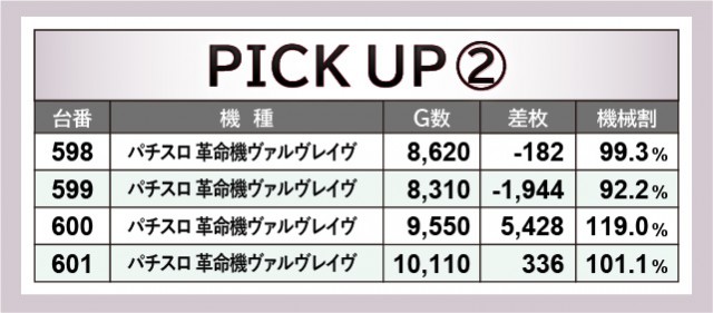 498~501番台の横並び好況スポットは、全台プラス差枚とはならなかったものの、ファンが手応えを感じていた様子だ。その中で『パチスロ 新鬼武者2』499番台+5,385枚という活躍を披露し、エリア一帯を盛り上げていた。そして『パチスロ 革命機ヴァルヴレイヴ』も全4台が好感触を得られる状況に。全台プラス差枚を記録できなかったが、600番台+5,428枚という熱を放ち、同様に盛り上がりをリードする存在となっていた様子だ。