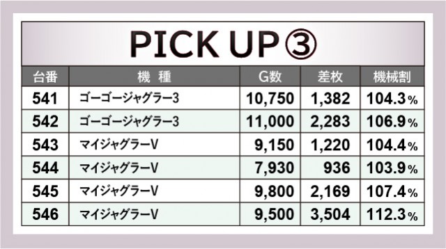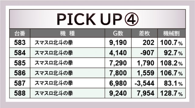 ピックアップされた優秀台をご覧の通り、バラエティーコーナーを含めた幅広い機種が活躍していた様子が見てとれる。その中で秀でた活躍を披露したのが、やはり『スマスロ北斗の拳』588番台+7,954枚だった。もちろん目玉の『ジャグラー』シリーズも安定感を披露しており、万回転OVERが多発している事実からも窺えるだろう。