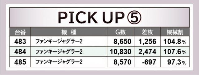 『ジャグラー』シリーズはいずれも手ごたえを感じられる状況にあり、多くのファンがGOGOランプの輝きに癒されていたことだろう。『マイジャグラーⅤ』547番台+3,504枚や『ファンキージャグラー2』484番台+2,474枚と、まとまった出玉を得て恍惚の表情を浮かべていたに違いない。そして『スマスロ北斗の拳』588番台+7,954枚という活躍が目に焼きつき、やはり同機種の高いポテンシャルは多くのファンの心を掴んでいると言える。