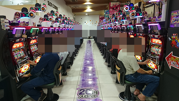 午後の20円パチスロでは、ジャグラーシリーズやハナハナシリーズが好評。シンプルな告知を味わっている様子もみられ、楽しい時間が流れているように思えた。