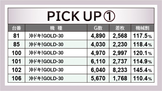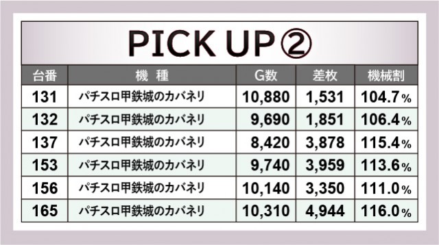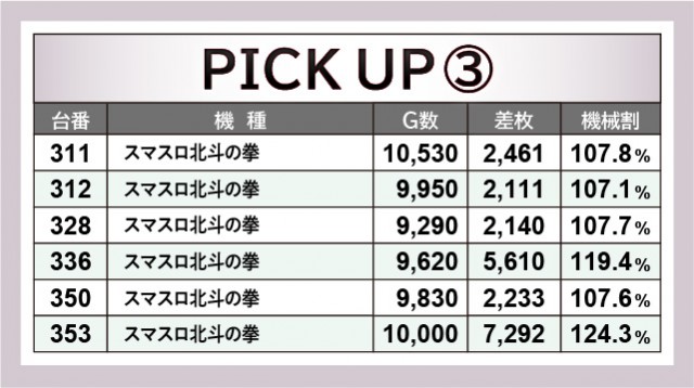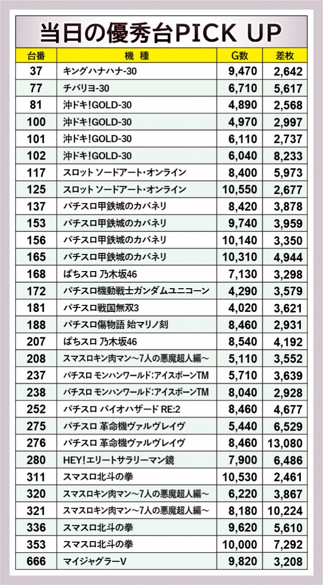 『沖ドキ!GOLD-30』『パチスロ甲鉄城のカバネリ』『スマスロ北斗の拳』の3機種は、全国的に見ても色褪せない人気を誇る名機たちだ。そんな彼らは102番台+8,233枚や165番台+4,944枚、353番台+7,292枚と差枚数でも結果を残しており、なぜ多くのファンから支持を集めているのかが窺えるだろう。回転数を見ても朝から終日打ち込まれているため、相当な手応えを感じていたとも想像できるばかりだ。