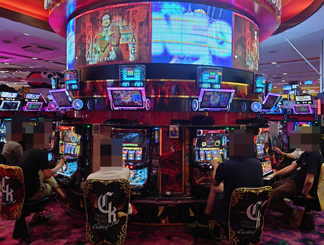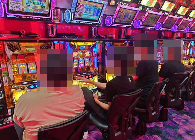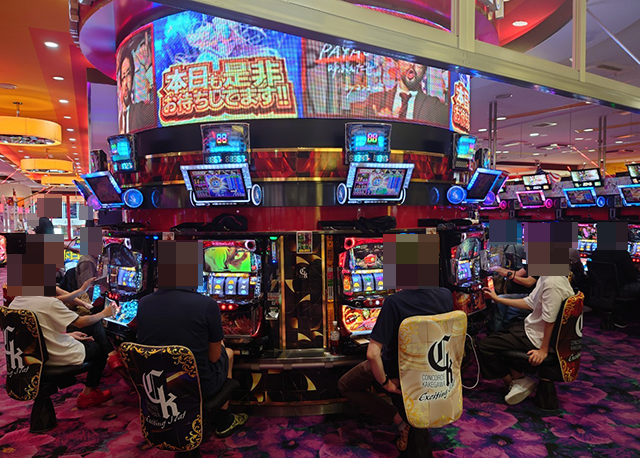 たくさんのプレイヤーが遊技を楽しんでおり、複数の台で華やかなシーンを確認している。