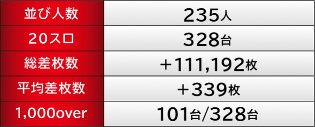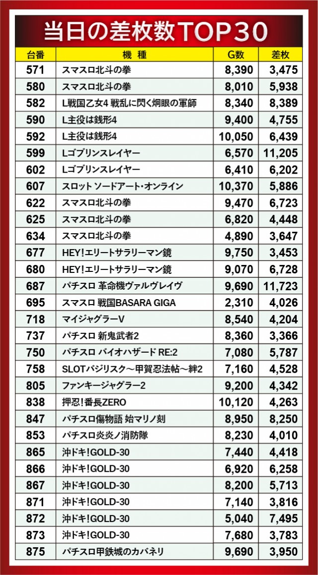 『Lゴブリンスレイヤー』599番台+11,205枚・『パチスロ 革命機ヴァルヴレイヴ』687番台+11,723枚と、2台の万枚OVER台が発生した当日。さらに『L主役は銭形4』『スロット ソードアート・オンライン』『押忍!番長ZERO』は万回転OVERを達成しており、他にも終日を通して打ち込まれた台が多数確認できた。また5千枚OVER台も数多く見られ、当日の館内は凄まじい熱気に包まれていたのは間違いない。