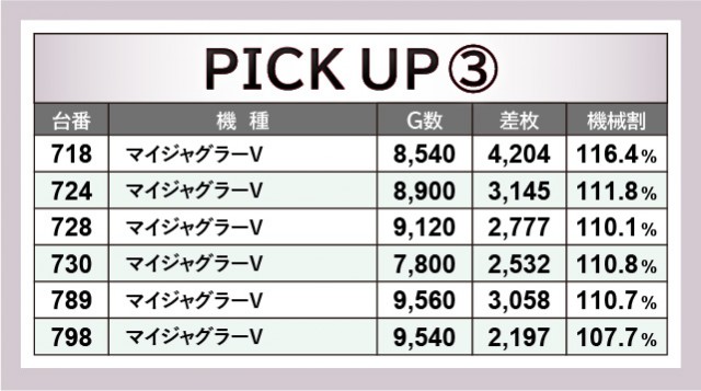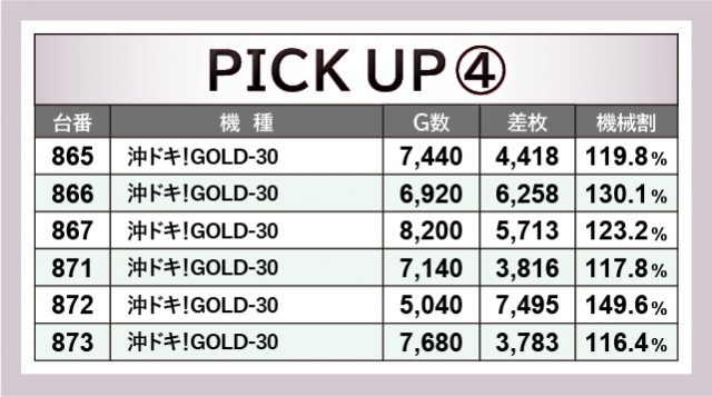 『マイジャグラーⅤ』もまた終日を通して高い稼働を披露し、さらには718番台+4,204枚といった大きな熱気が放たれていた。『沖ドキ!GOLD-30』も同様に、872番台+7,495枚や866番台+6,258枚といった大台突破台が生まれ、島全体が大きな盛り上がりに包まれていたと言える。いずれの機種も大量設置されている機種であるため、ファンは安心してレバーを叩けたのではないだろうか。