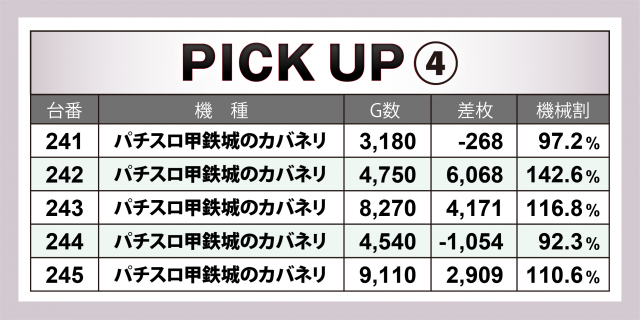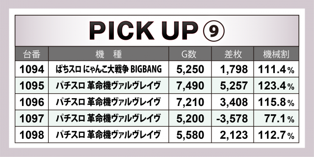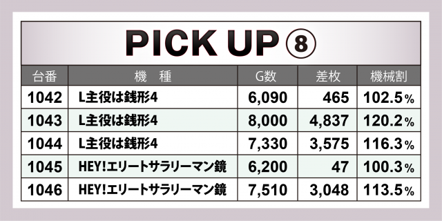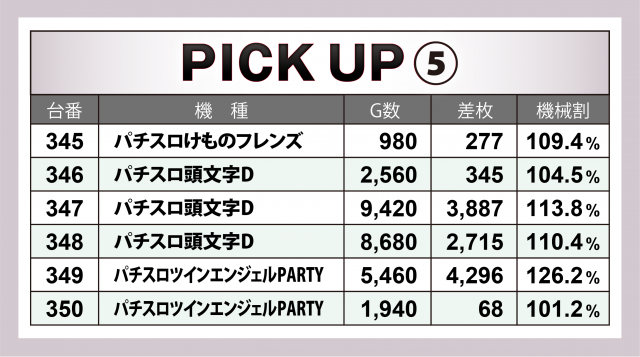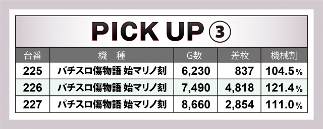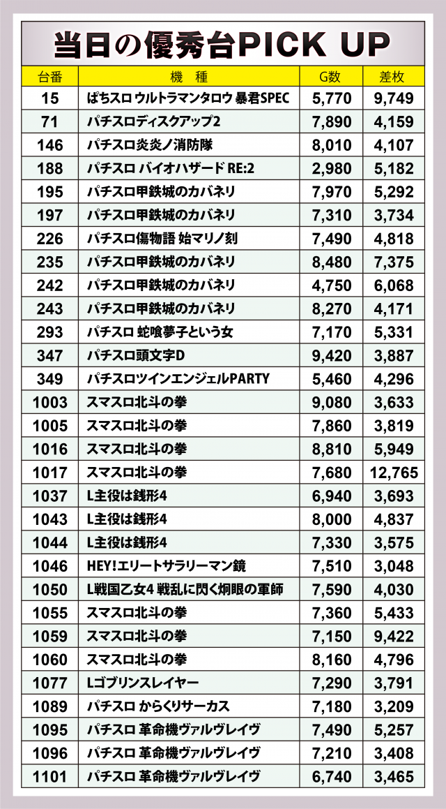 まずは当日の優秀30台PICK UPから。なんと30台の全てが差枚数+3千枚以上を達成というハイレベルぶりで、+4千枚以上は全体の3分の2弱となる19台、+5千枚オーバーは全体の3分の1強となる11台、+6千枚オーバーは5台と、恒例だが成績上位台は高水準の差枚数となった。