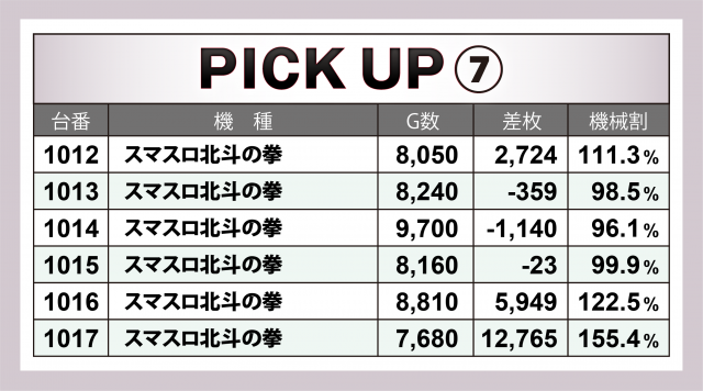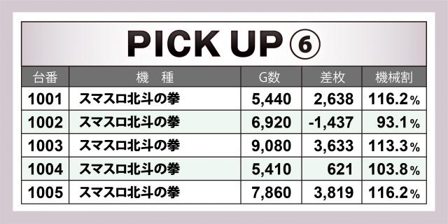 前回に続いてハイクオリティとなったのが『スマスロ北斗の拳』。+1万2千枚オーバーをトップに+6千枚弱×1&+3千超×2&+2千超×2と、複数の優秀台を輩出した上に、横並び以外でも1059番台が+9千枚突破を果たした。