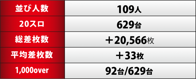 今回、[1000円/46枚]スロ629台はトータル+20,566枚と勝利を収めたものの、万枚突破台あり&上位30台の結果を考えると、些か少ないように感じられる。