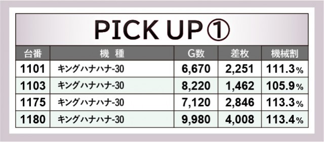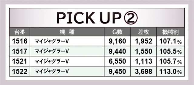 『キングハナハナ-30』『マイジャグラーⅤ』は多くのノーマル機群のなかでも、特に人気を集めていた様子だ。1180番台+4,008枚や1522番台+3,698枚と、回転数と差枚数が比例する展開が顕著だったのも見逃せない。遊技していたファンはコンスタントに当選する大当りを前に、恍惚の表情を浮かべていたのは間違いないだろう。