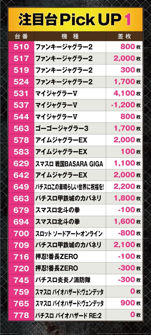 店内状況を見てみると、様々な場所で好調台が目に付く結果となった。特にジャグラーシリーズの好調台が多く、11台中10台がプラスと見事な結果を残していた。
