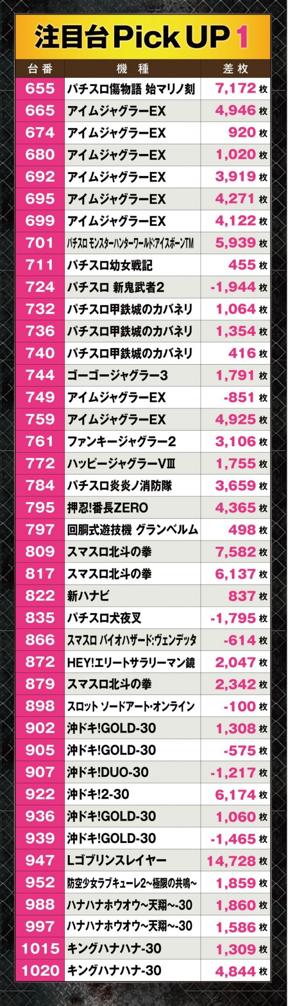 ほかにもスマスロ・6.5号機・Aタイプ・沖スロなど、店内のあちこちで好調台が確認できる結果となった。次回開催時にはこれらを参考に、是非チャンスを掴んで欲しい。