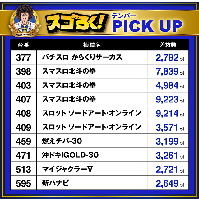 459番台の「燃えチバ-30」と471番台の「沖ドキ!GOLD-30」も3,000pt超!