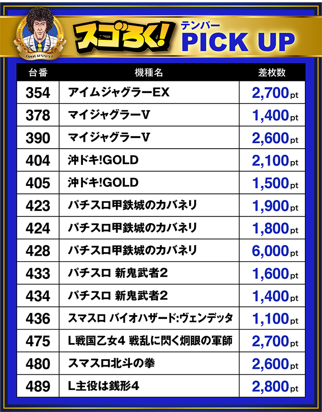 「沖ドキ!GOLD」は404番台が2,100pt、405番台が1,500ptと並んでプラス!