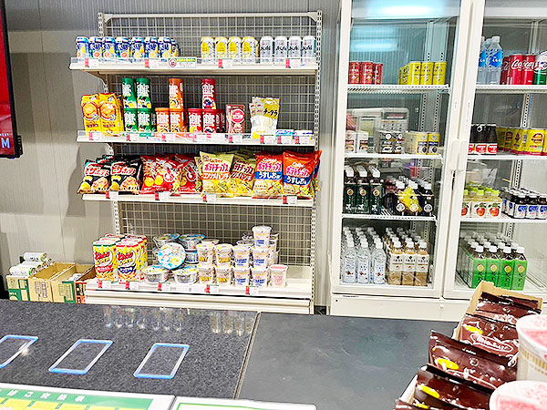 景品コーナーにはお菓子・インスタント食品・ドリンクなど多彩なアイテムが並んでおり、プレイヤーたちの興味をそそっていた。
