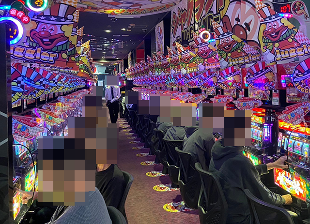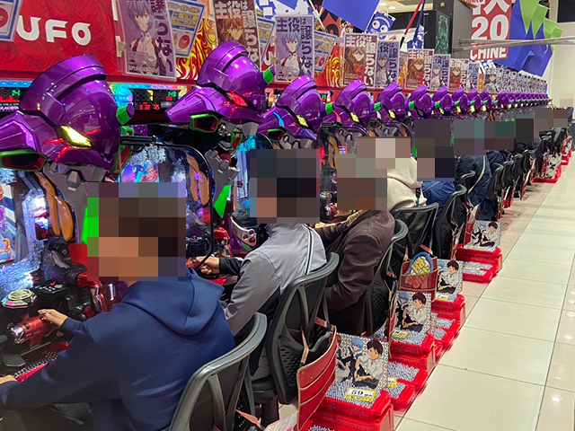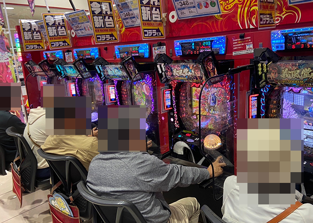 パチンココーナーをみると、増台された機種が朝イチからの盛り上がりをキープ。パフォーマンスを披露するプレイヤーが並び、ひときわ目立つ場所となっていた。