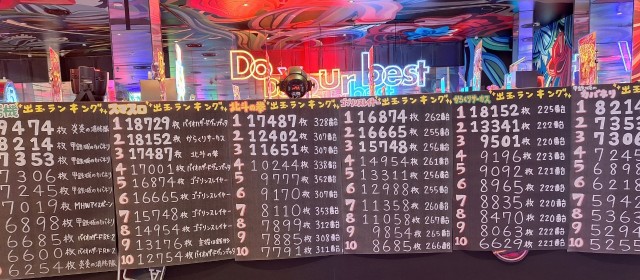 前述したハイスコア台の他にも、この上の写真の様に店内では至る所でドル箱表示や出玉札を見受けられた。
