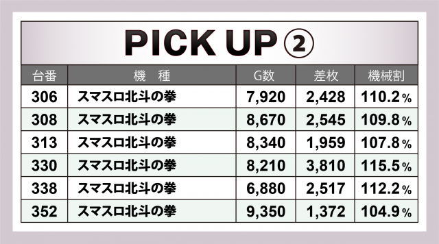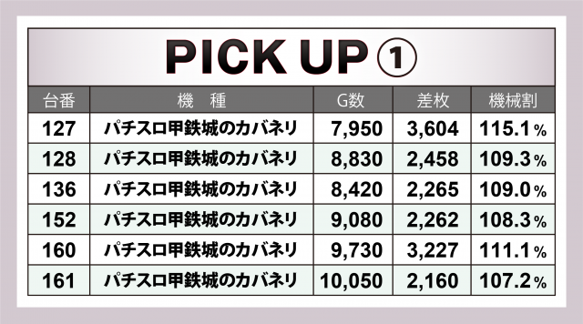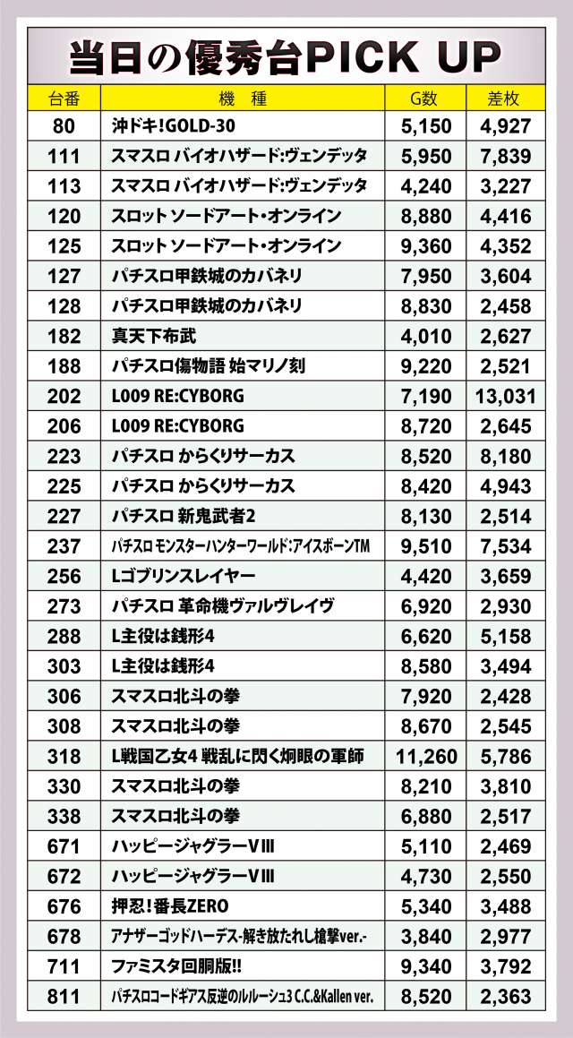 最初は優秀30台PICK UPから。同店の取材ではよく見られる光景だが、30台全てが差枚数+2千枚以上を達成、+3千枚以上は全体の6割弱となる17台、+4千枚オーバーは全体の3分の1となる10台、+5千枚オーバーは6台、+7千枚オーバーは4台と、今回も高水準をキープできた。
