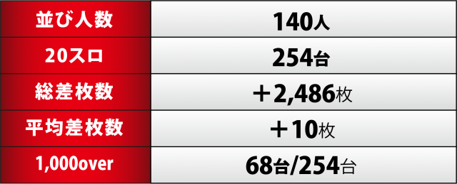 だが、20スロ254台のトータル差枚数は+2,486枚となり、万枚突破台や優秀30台のレベルを考慮すると、些か物足りなさを感じてしまう。