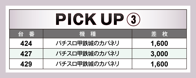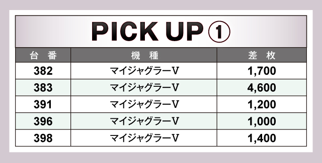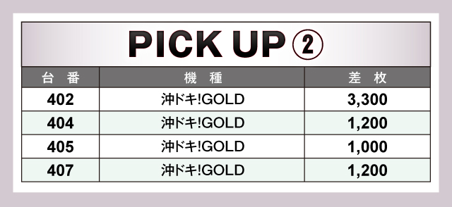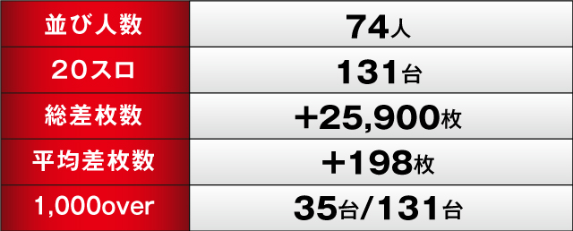 優秀台、ピックアップ機種ともに好調で、トータルの差枚は+25,900枚を記録。余裕のプラスで、危なげなく連勝を飾ってみせた。1,000over台も35台/131台をマークしており、今回もファンの期待にしっかり応えたのであった。