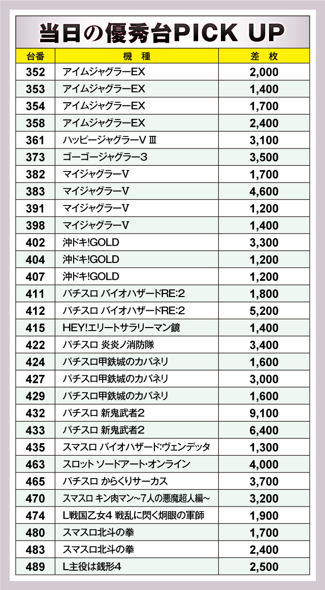 優秀台としてまず注目したいのは『パチスロ 新鬼武者2』。432番台が+9,100枚、433番台が+6,400枚と、2台並んでの猛爆を見せており、あらためてそのポテンシャルの高さを披露した。それに続いたのが+5,200枚をマークした『パチスロ バイオハザード RE:2』の412番台。最近は後輩のスマスロの活躍が目立っているが、まだまだこの機種も現役バリバリだ。『マイジャグラーⅤ』も負けてはいない。383番台が+4,600枚を記録。相変わらずの安定感だ。以下、+4,000枚の『スロット ソードアート・オンライン』463番台、+3,700枚の『パチスロ からくりサーカス』465番台、+3,500枚の『ゴーゴージャグラー3』373番台、+3,400枚の『パチスロ炎炎ノ消防隊』422番台、+3,300枚の『沖ドキ!GOLD』402番台と続いた。