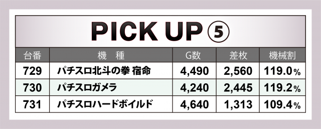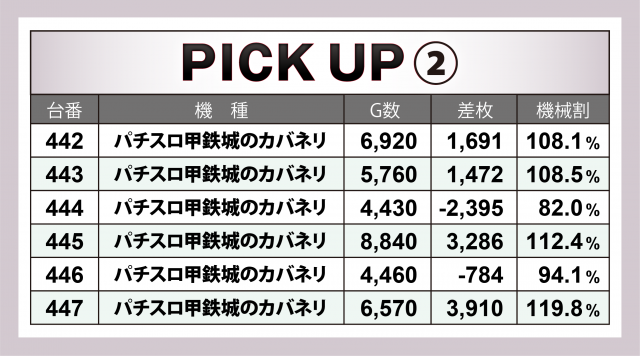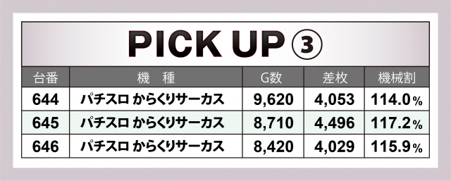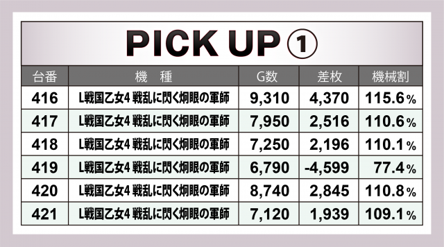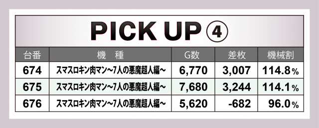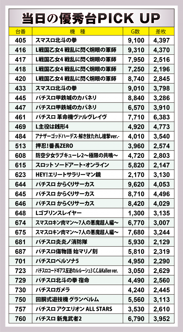 最初は優秀30台PICK UPのチェックから。同店のレベルの高さが取材の度に現れているが、30台全てが+2千枚以上を達成、+3千枚以上は全体の6割弱となる17台、+4千枚オーバーは7台、+6千枚オーバーが1台と、前回に比べると若干控えめだったが、それでもハイスコア台がいくつも散見された。