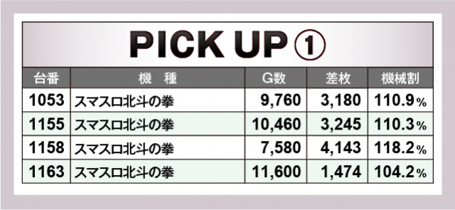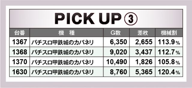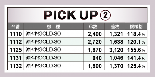 続いては好調3機種計13台をチェック。まず、『スマスロ北斗の拳』で、1158番台の+4,143枚を筆頭に4台のトータル差枚数は+1万2千枚をマーク。次いで『沖ドキ!GOLD-30』では、1125番台の+3,120枚を筆頭に5台のトータル差枚数は+8千枚を突破した。さらに、『パチスロ甲鉄城のカバネリ』では、1630番台の+5,365枚を筆頭に4台のトータル差枚数は+1万3千枚オーバーとなった。いずれも王道メイン機種として活躍するマシン達が明らかな好感触によってこの日の勝利に大きく貢献していたのは明確だろう。
