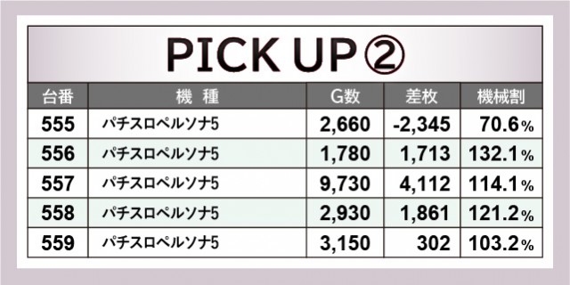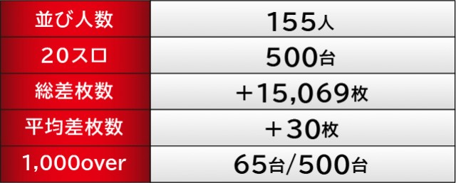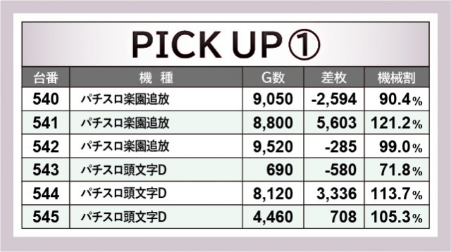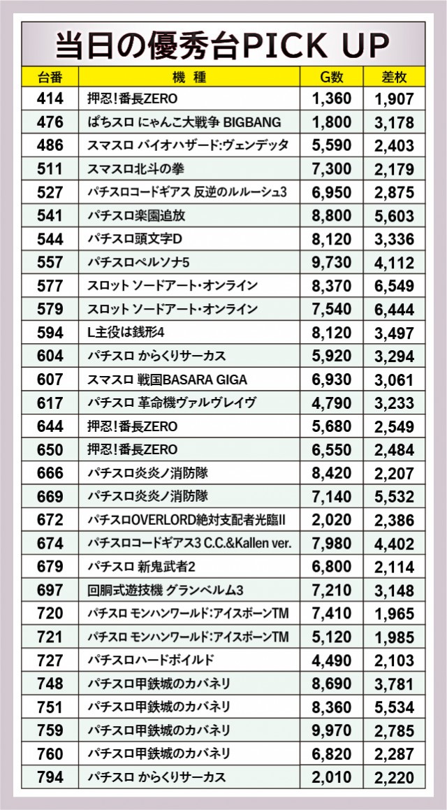 ピックアップされた優秀台に目を通すと、非常に多くの機種が名を連ねていることが分かる。メイン機種からバラエティーコーナーに設置された機種に至るまで、あらゆる機種にチャンスが眠っていたと言える。その中で『スロット ソードアート・オンライン』577番台+6,549枚・579番台+6,444枚と気を吐く活躍を見せ、他にも『パチスロ楽園追放』541番台+5,603枚という熱気が見られるなど、各所で盛り上がりを披露していた。