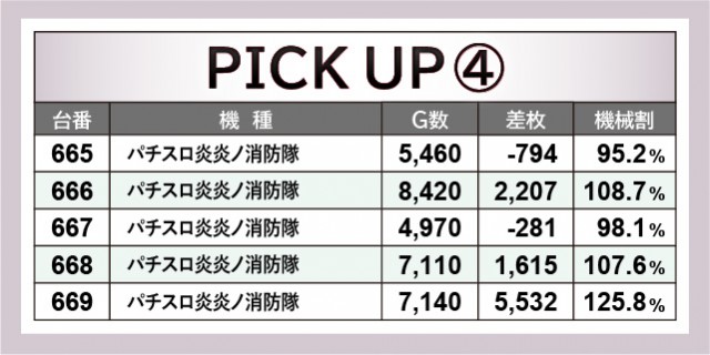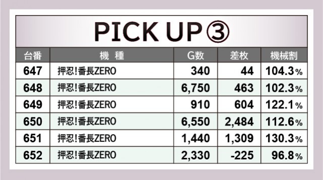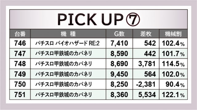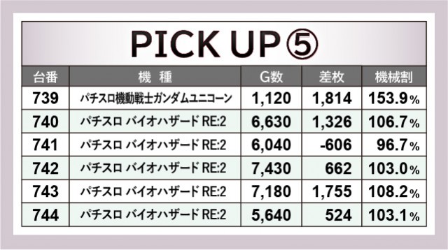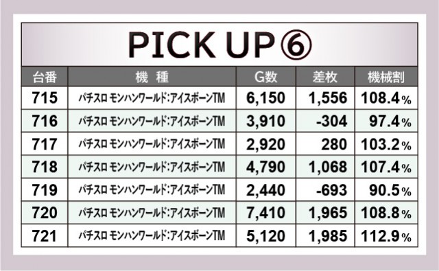 『パチスロ炎炎ノ消防隊』669番台+5,532枚や『パチスロ甲鉄城のカバネリ』751番台+5,534枚など、こちらでも大きな熱を放っていた台を確認できる。その一方で『パチスロ機動戦士ガンダムユニコーン』『パチスロ バイオハザード RE:2』『パチスロ モンスターハンターワールド:アイスボーンTM』も安定感のある状況となっており、ファンは心地良さを覚えながらレバーを叩いていたに違いない。