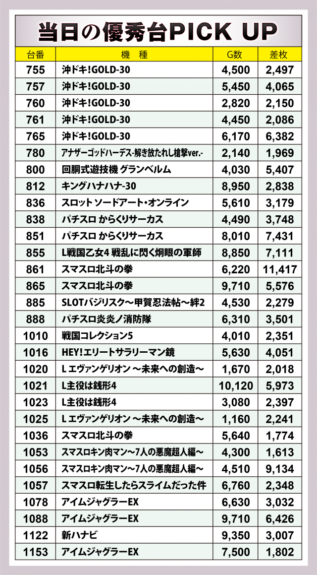 まずは優秀30台のチェックから。30台のうち全体の9割弱となる26台が差枚数+2千枚以上を達成、+3千枚以上は全体の半数強となる16台、+4千枚オーバーは全体の3分の1強となる11台、+5千枚オーバーは9台と、+6千枚オーバーは6台、+7千枚オーバーは4台と、多数のハイスコア台で溢れる結果となった。