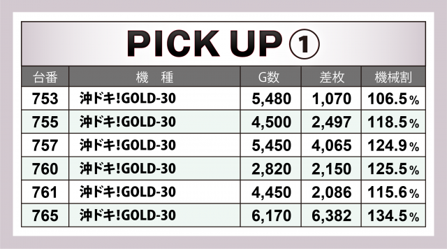 また『沖ドキ!GOLD-30』6台は+6千4百枚弱をトップに、+4千枚超×1、トータルで+1万8千枚超に達した。