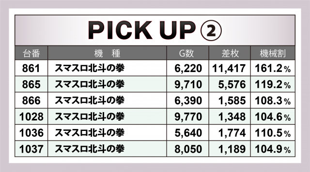 今回のビッグヒットは『スマスロ北斗の拳』6台。+1万1千枚オーバーと+5千6百枚弱が1台ずつでその合計は+2万3千枚弱に及んだ。