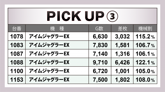 続いては好調3機種6台ずつ計18台にスポットを当てよう。同店ではおなじみとなる3マシンに好成績が多発し、18台全てが4桁以上のプラスを果たした。