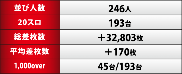 以下では20スロ全193台の出玉データを基に、当日の優秀台を詳しく追っていこう。