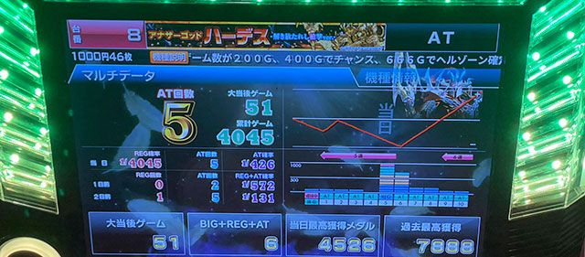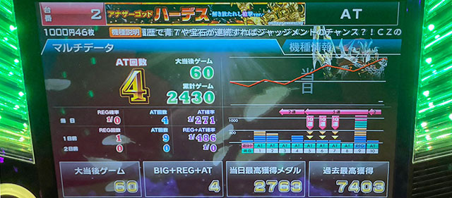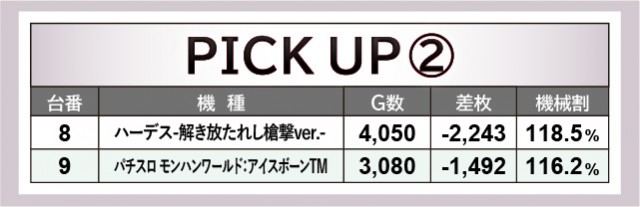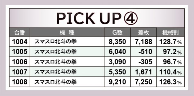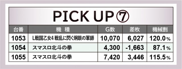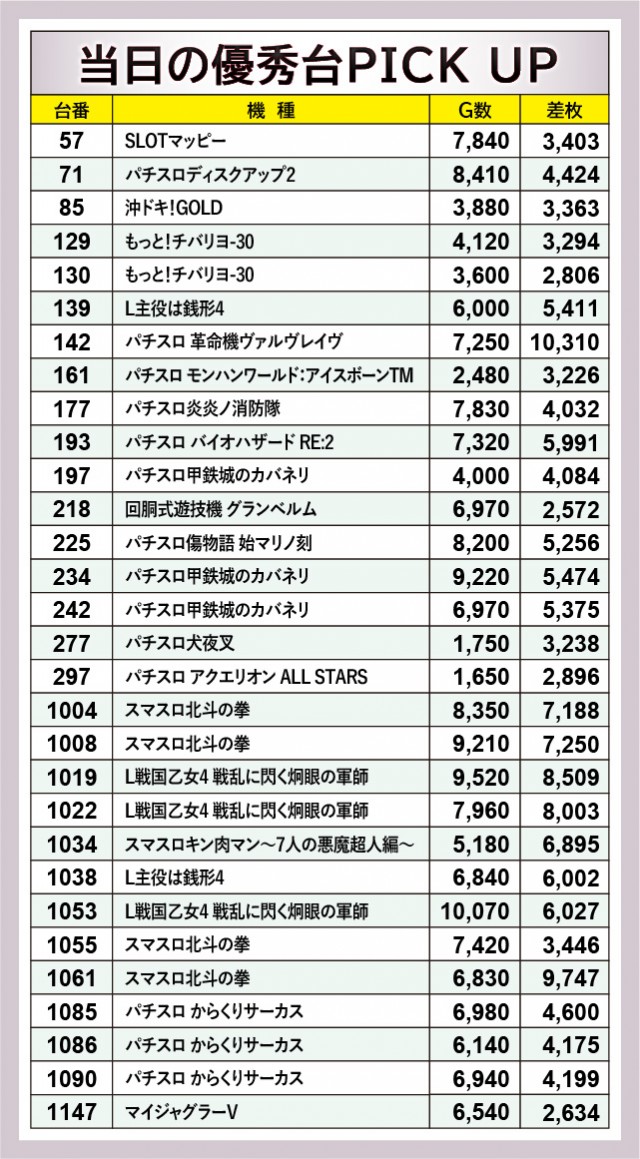 『アナザーゴッドハーデス-解き放たれし槍撃ver.-』1・2番台は2千枚OVERを達成。さらに『もっと!チバリヨ-30』129番台+3,294枚など、各所にてまとまった出玉を獲得していたのが顕著だ。これを上回ったのが『スマスロ北斗の拳』であり、1004番台+7,188枚・1008番台+7,250枚と、凄まじい熱気を放っていたのが目に焼きつく。