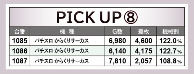 『L主役は銭形4』1038番台+6,002枚や『L戦国乙女4 戦乱に閃く炯眼の軍師』1053番台+6,027枚と、こちらでも大きな熱量を確認できる。そして『パチスロ からくりサーカス』からは2台の4千枚OVERが発生しており、店内各所が盛り上がっていた様子が窺えるだろう。万回転OVERを達成している台が生まれている事実からも、ファンは大きな手応えを感じていたのは間違いない。