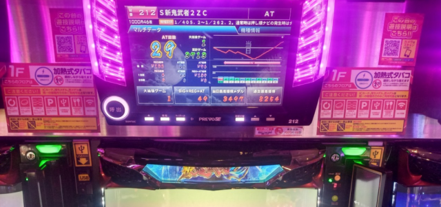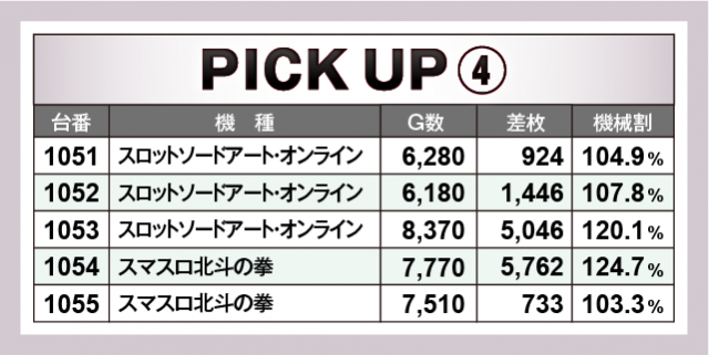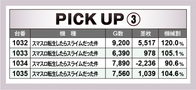 続いては当日の好調機種をみていこう。『パチスロ傷物語始マリノ刻』で2台の+1千枚オーバー、『パチスロ甲鉄城のカバネリ』で2台の+2千枚オーバーなど、各所で熱気を放っていた様子が顕著だ。一方で、絶大な人気を誇るスマスロ機から『スマスロ転生したらスライムだった件』『スロットソードアート・オンライン』『スマスロ北斗の拳』『パチスロ革命機ヴァルヴレイヴ』で横並び好況スポットを形成し、いずれも安定感のある状況にファンは心地良さを覚えながらレバーを叩いていたに違いない。