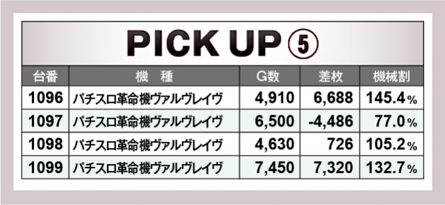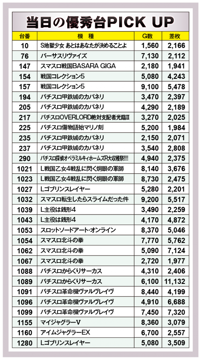 まずは優秀台30台のピックアップから。30台のうち27台が+2,000枚オーバーを達成!+3,000枚オーバーが14台、+5,000枚オーバーが8台となった。後述する好調機種以外では、1089番台の『パチスロからくりサーカス』で+11,132枚の万枚超を記録し、この日のトップ差枚数をマークした。次いで、157番台の『戦国コレクション5』で+5,478枚、さらに1043番台の『L主役は銭形4』で+4,872枚となった。