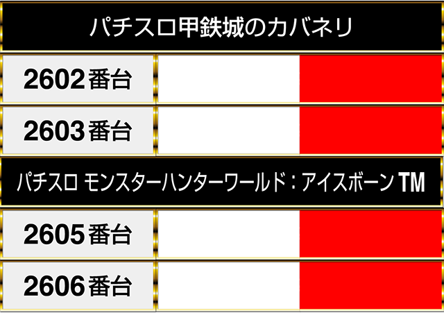 『パチスロ甲鉄城のカバネリ』の2602番台から『パチスロ モンスターハンターワールド:アイスボーンTM』の2606番台までが並んでプラスptを記録!