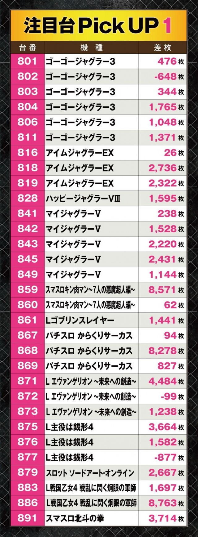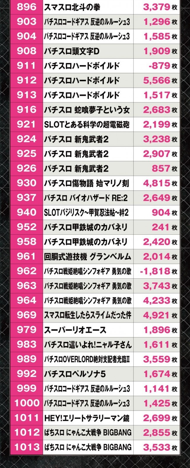 今回も全台系と並びを中心に好調台が目につく結果となった。まずは全台系。『パチスロハードボイルド』と『パチスロ戦姫絶唱シンフォギア 勇気の歌』が対象となっており、どちらも平均+2,000枚オーバーと見事な活躍を見せている。
