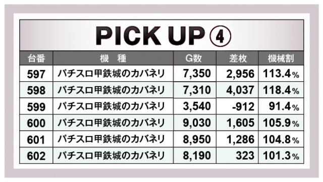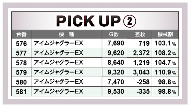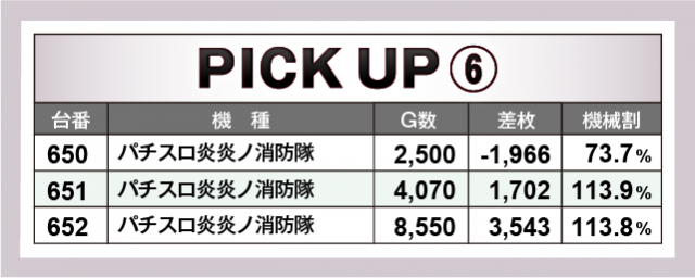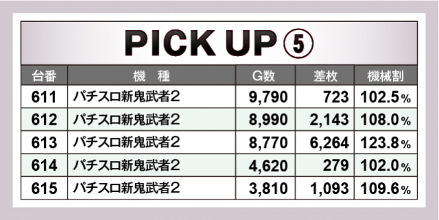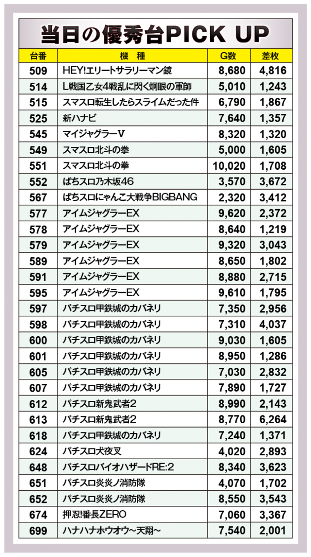 優秀台をご覧の通り、各所で凄まじい熱気が放たれていた様子がハッキリと分かる。その中で『パチスロ新鬼武者2』613番台+6,264枚・『HEY!エリートサラリーマン鏡』509番台+4,816枚と大きな熱量を確認で、他にも『パチスロ甲鉄城のカバネリ』598番台+4,037枚・『ぱちスロ乃木坂46』552番台+3,672枚などが発生。回転数を見ても手応えのほどを感じ取ることができ、ファンは有意義な時間を過ごせたことだろう。